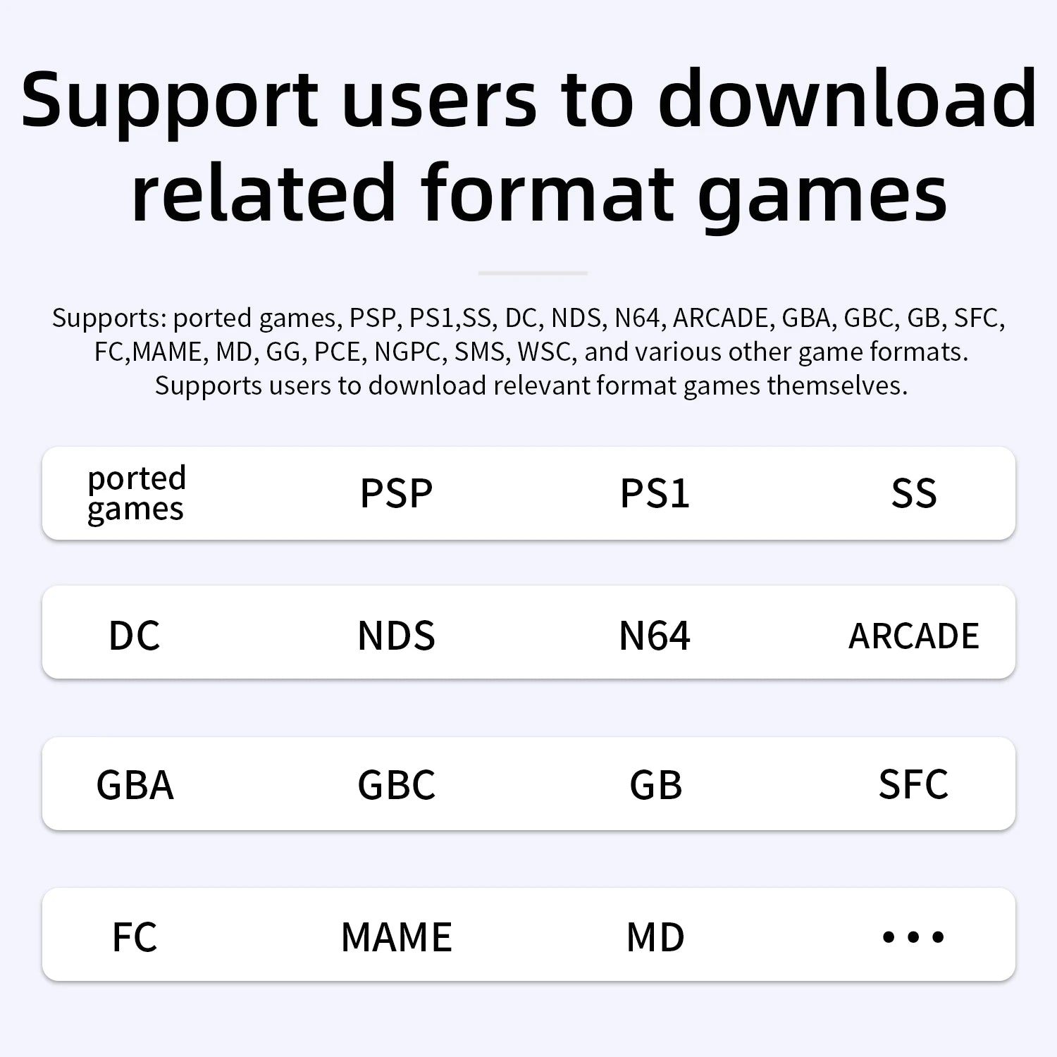 1.Supports: ported games, PSP, PS1, N64,DC, NDS,ARCADE, GBA, GBC, GB, SFC, FC, MAME, MD, GG, PCE, PCE-CD, NGPC, sega32x, SMS, WSC, and various other game formats.