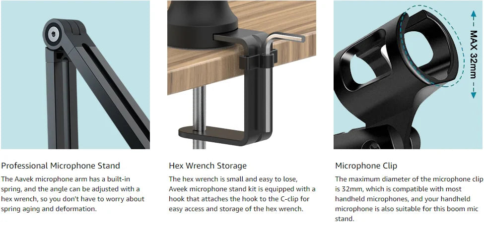 The Aveek microphone arm is foldable and easy to carry. When not in use, simply fold the boom arm up to save storage space without needing to remove it from your desk.