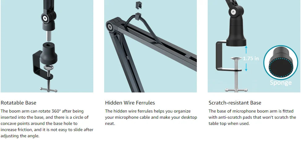 Microphone adapter Horizontal rotation range: 270°; Elbow joint arm Horizontal rotation range: 180°; Bottom articulated arm Horizontal rotation range: 360°. Easily adjust the microphone position for optimal sound quality and comfort.