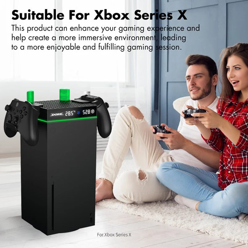 This product is a multifunctional cooler specifically designedfor the Xbox Series X/S gaming console. It is placed on top ofthe Xbox Series X/S console and connected via TYPE-C to theconsole's USB port. It features a large-sized silent fan, anintegrated high-precision micro-processing control chip, andautomatic temperature detection for intelligent adjustment offan speed and lighting changes. The full-featured displaypanel can instantly show temperature and fan speed.Additionally, it is equipped with two smart charging interfacesfor battery packs. The product seamlessly fits on top of theconsole, boasting a novel appearance, sleek design, anduser-friendly operation, making it the top choice for Xboxgamers as it perfectly integrates with the gaming console.