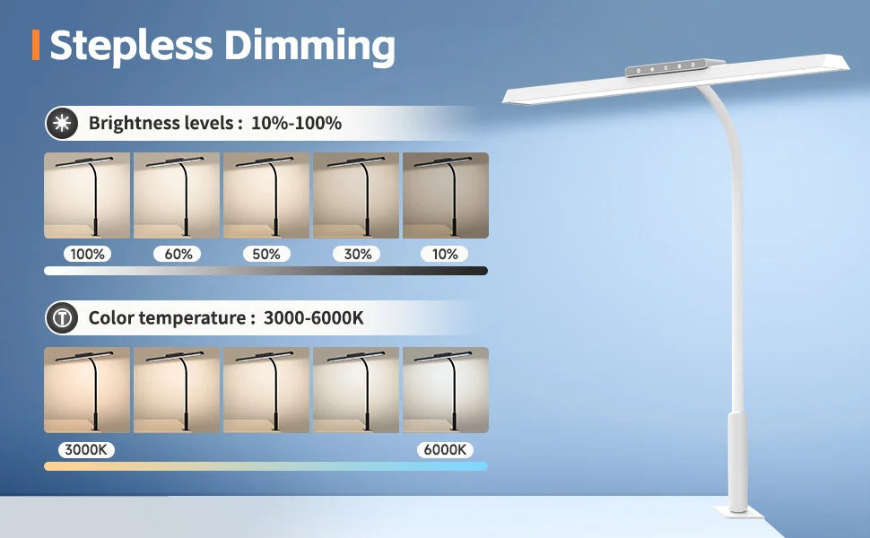 Stepless color tempering and bright: Free adjust color temperature(3000K - 6000K); Free adjust brightness levels(10% - 100%)