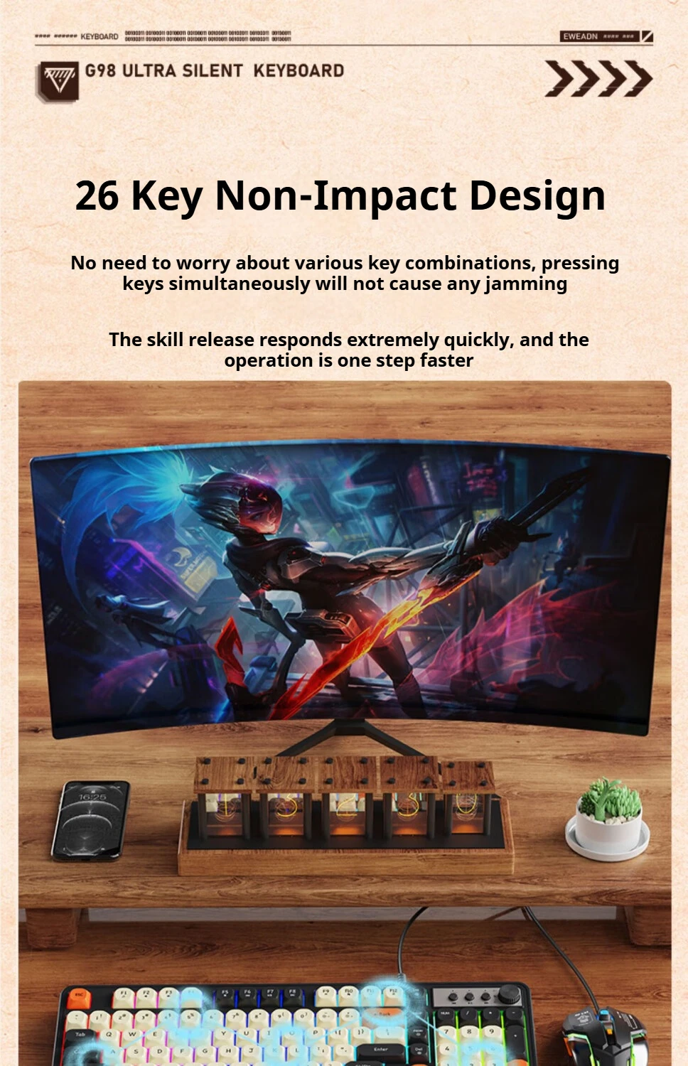 EWEADN Pro Gaming Keyboard Wired, 98-Key Silent Rainbow RGB Backlit, Ergonomic Compact Keyboard for eSports, Office, PC Gamers