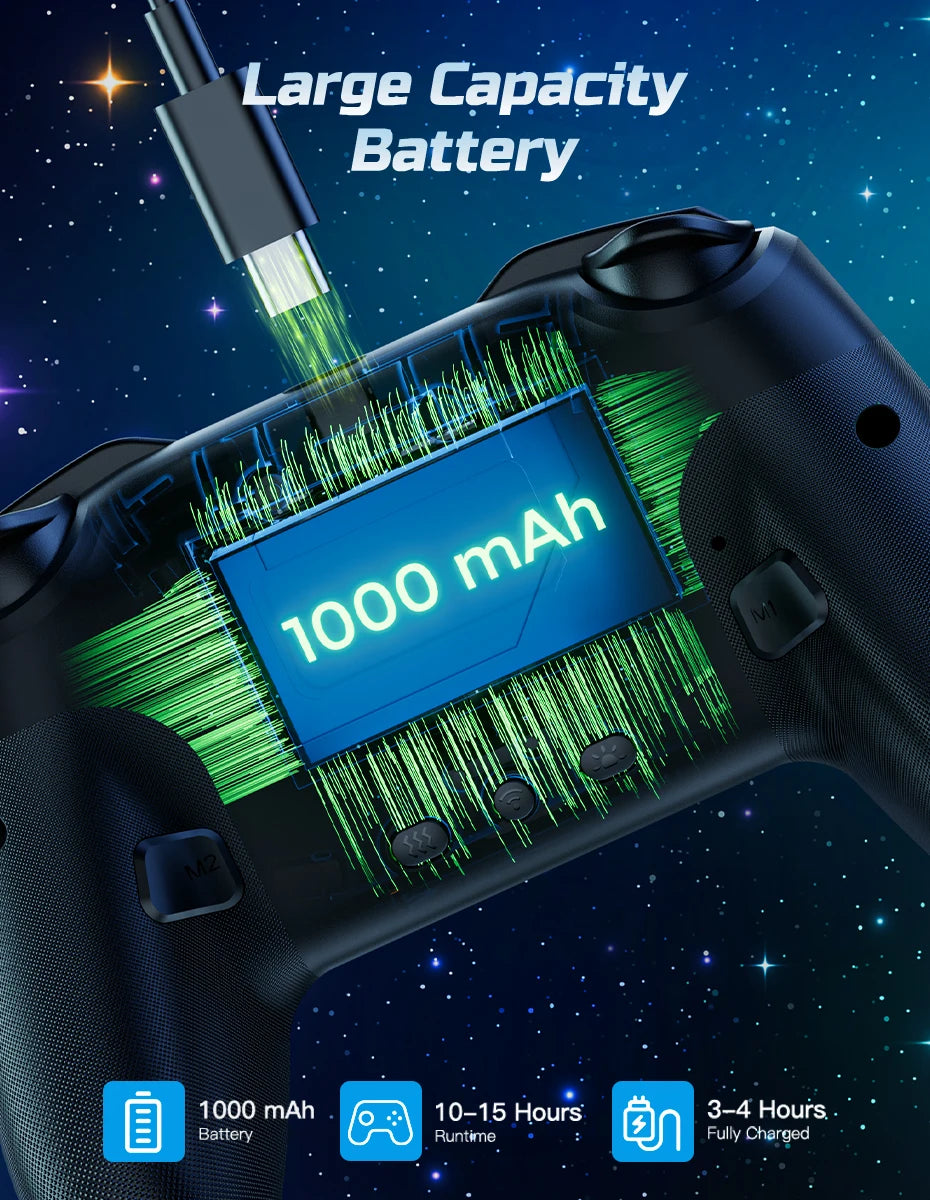 The wireless controller built-in 1000 mAh battery which provide a longer game time (about 10-15 hours) on LED lit mode is turned on. Fully charge takes only 3-4 hours with an included USB type c fast charging cable